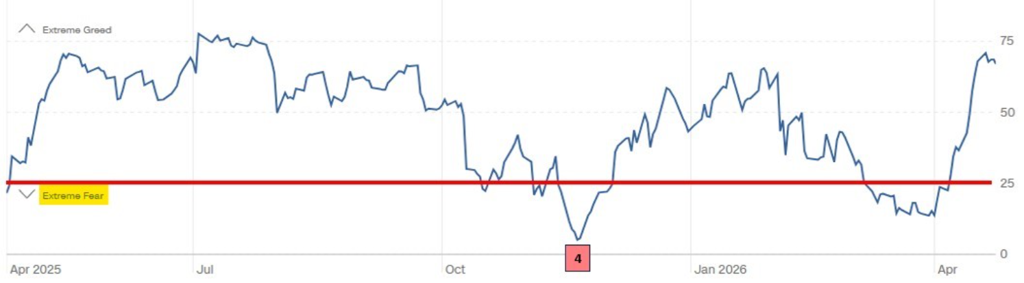 As you can see from chart above the current reading (as of 4/23/26) the Index is well into the Greed range. Hard to believe considering the conflict in Iran continues. Isn’t there blood in the streets? One month ago, shortly after the bombs dropped, the index registered a 14 or Extreme Fear. It is amazing how quickly the mood changed from negative to positive. Markets often climb a 'wall of worry,' where the resolution of uncertainty (even if the news is grim) is preferred by investors over the unknown.