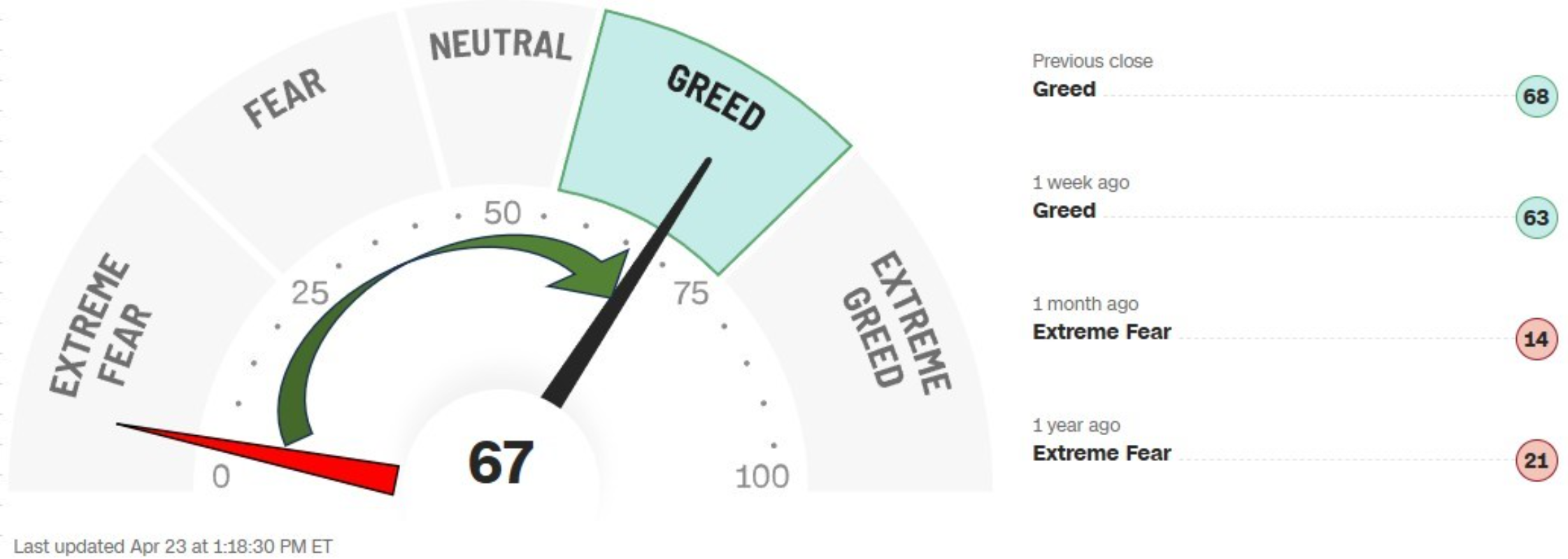 One way just might be the CNN Fear & Greed Index. This Index is published each weekday. It measures seven indicators on a scale from one to one hundred as a way to gauge the “mood” of the stock market. A measure between one and twenty-five is considered to be an extremely fearful environment. Investors feel neutral with a score of fifty. Extreme Greed sets in with a tally over seventy-five.