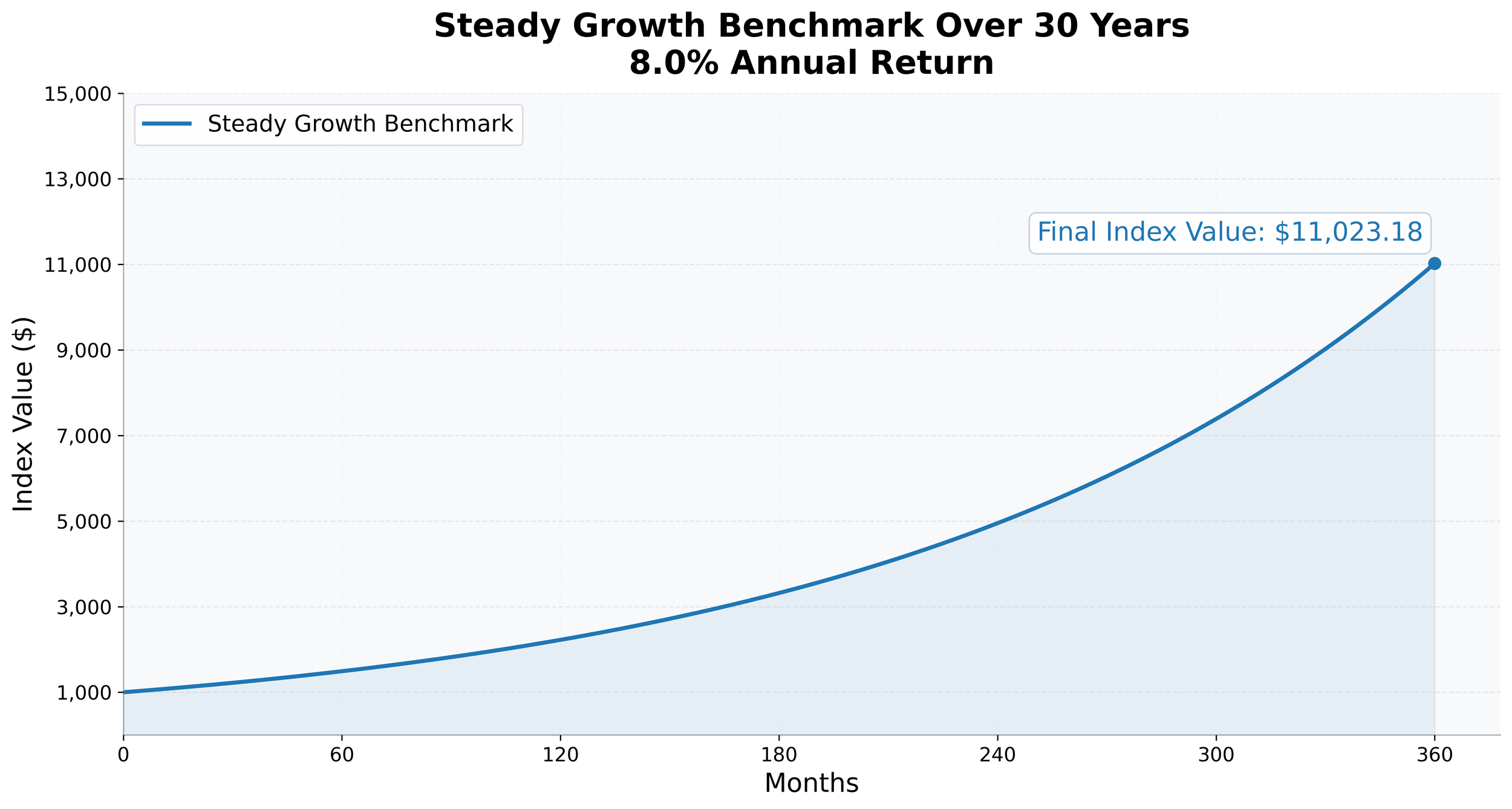 We start by defining the simplest benchmark we can, an “index” that grows at a set annualized rate of return with zero volatility. The starting value of the index is $1,000 and we let the index grow for 30 years (360 months) at an annual 8% rate of return. If an investor were to invest $1,800 into this index each month, the investor would end with a final value of $2,715,288.50.