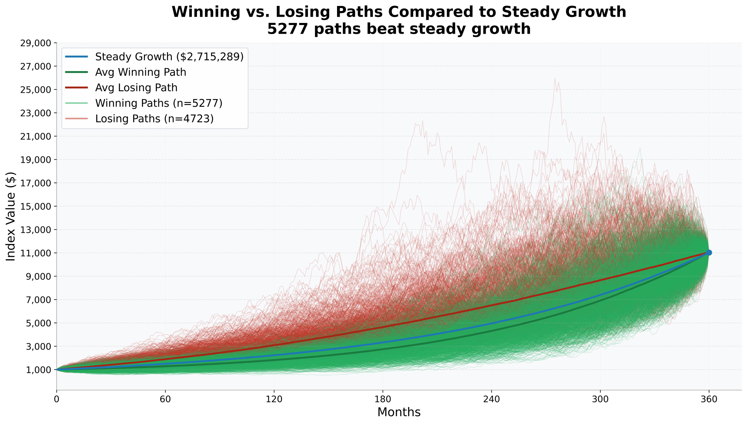 To better understand what drives superior outcomes in this context, we next examine which types of market paths tend to produce the strongest results for a steady investor. Do better outcomes come from paths that remain above the steady‑growth benchmark, below it, or does the path itself not matter if average returns are the same?