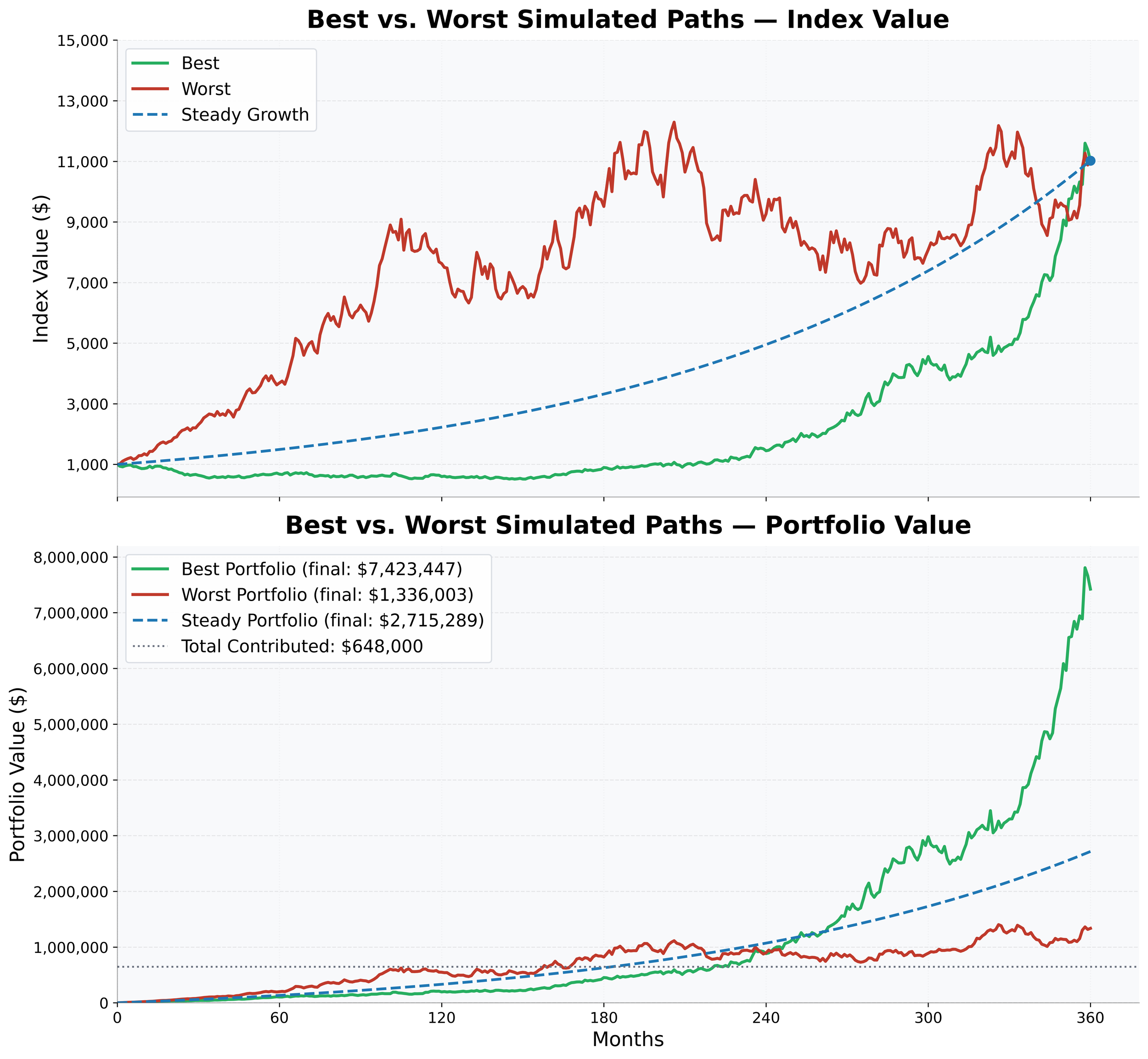 The contrast becomes especially clear when comparing extreme scenarios. The most successful path remains below the steady growth benchmark for most of the investment horizon and rises sharply near the end. The worst performing path follows the opposite pattern, delivering strong early gains before lagging later. This contrast highlights how the sequence of returns (not their long‑term average) has a powerful effect when contributions are made consistently over time.