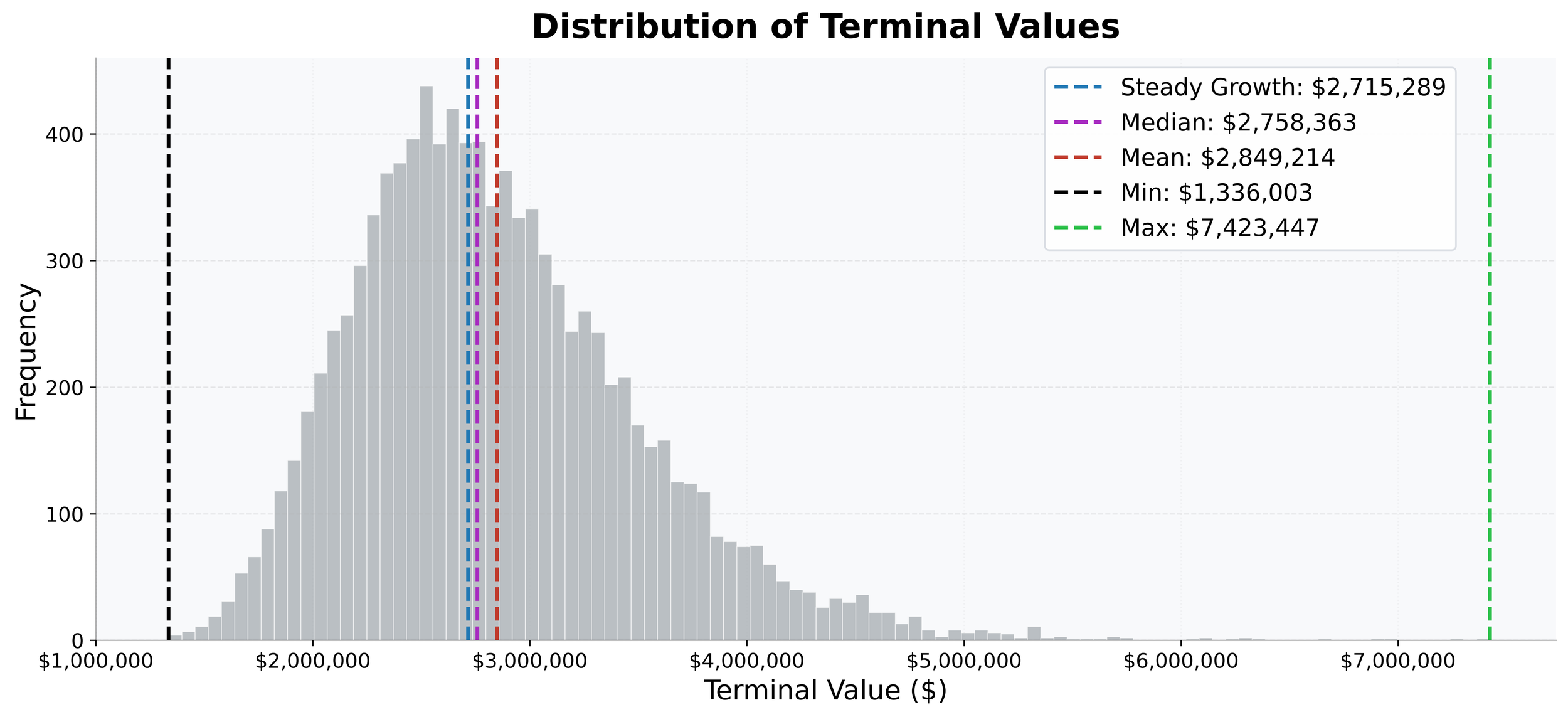 Across all simulations, slightly more than half of the outcomes produced a higher final portfolio value than the steady‑growth scenario. In other words, introducing volatility (while keeping average returns the same) benefited a consistent investor more often than not. The distribution below shows the full range of outcomes.